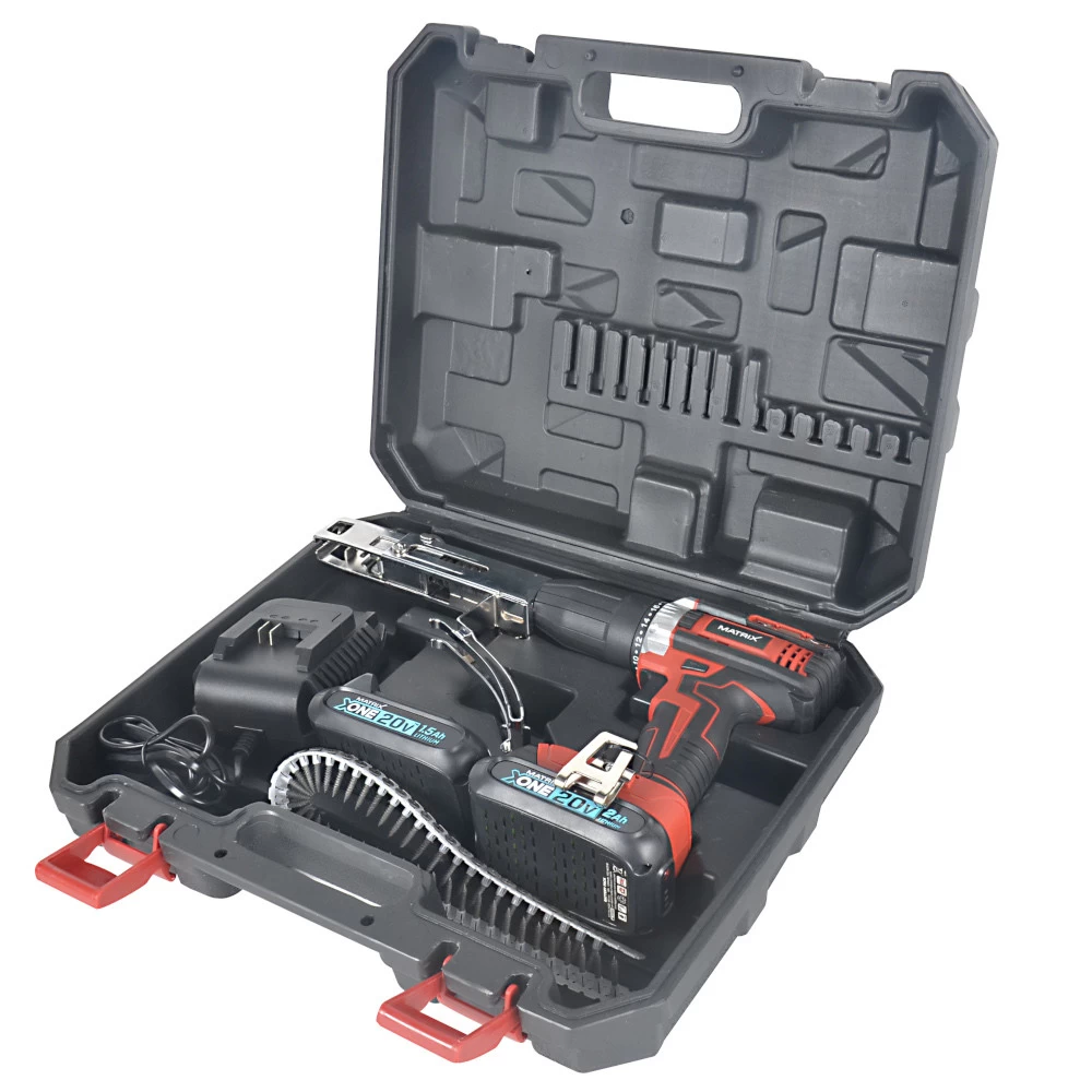 Der Akkuschrauber für den Trockenbau mit 550 Watt kräftigem Motor ist mit einem werkzeuglosen 10 mm Bohrfutter ausgestattet. Mit dem Trockenbauschrauber können Schnellbauschrauben von 25 bis 45 mm mühelos aufnehmen und die automatische Füllvorrichtung sorgt für einen schnellen Arbeitsfortschritt, da stets eine Schraube im Schraubendreher vorhanden ist. Im Lieferumfang sind zwei 20 V Li-Ion Akkus, 1 Schraubenkette mit 50 Schrauben 25 mm und ein robuster Transportkoffer aus Kunststoff enthalten.