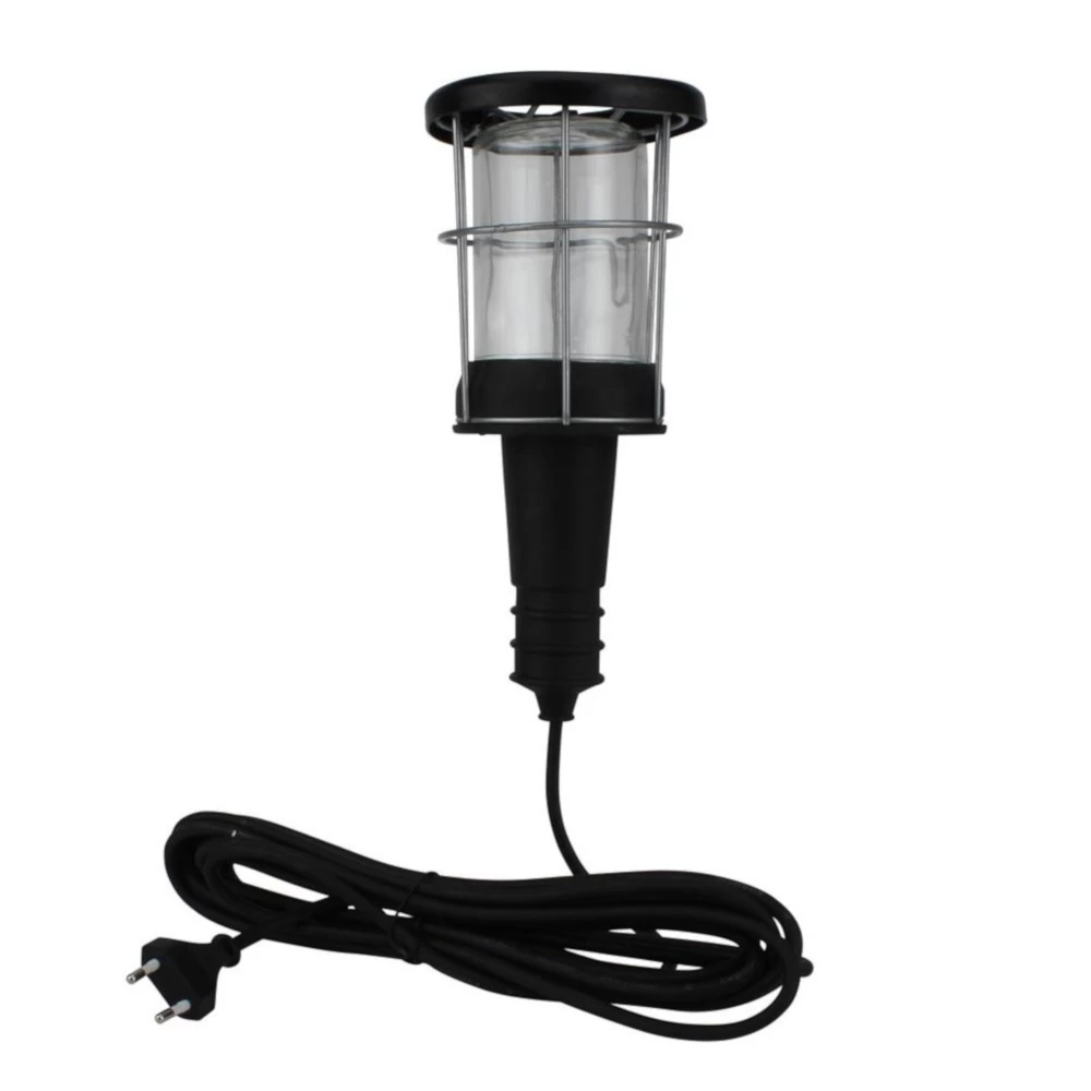 Werkstatt Arbeitsleuchte mit Gummi Handgriff und 5m Kabellänge. Die robuste Handleuchte verfügt über einen verzinkten Metall-Schutzkorb und Schutzglas. Mit dieser Werkstattlampe ist der Arbeitsbereich immer optimal ausgeleuchtet. Lieferung erfolgt ohne Leuchtmittel.