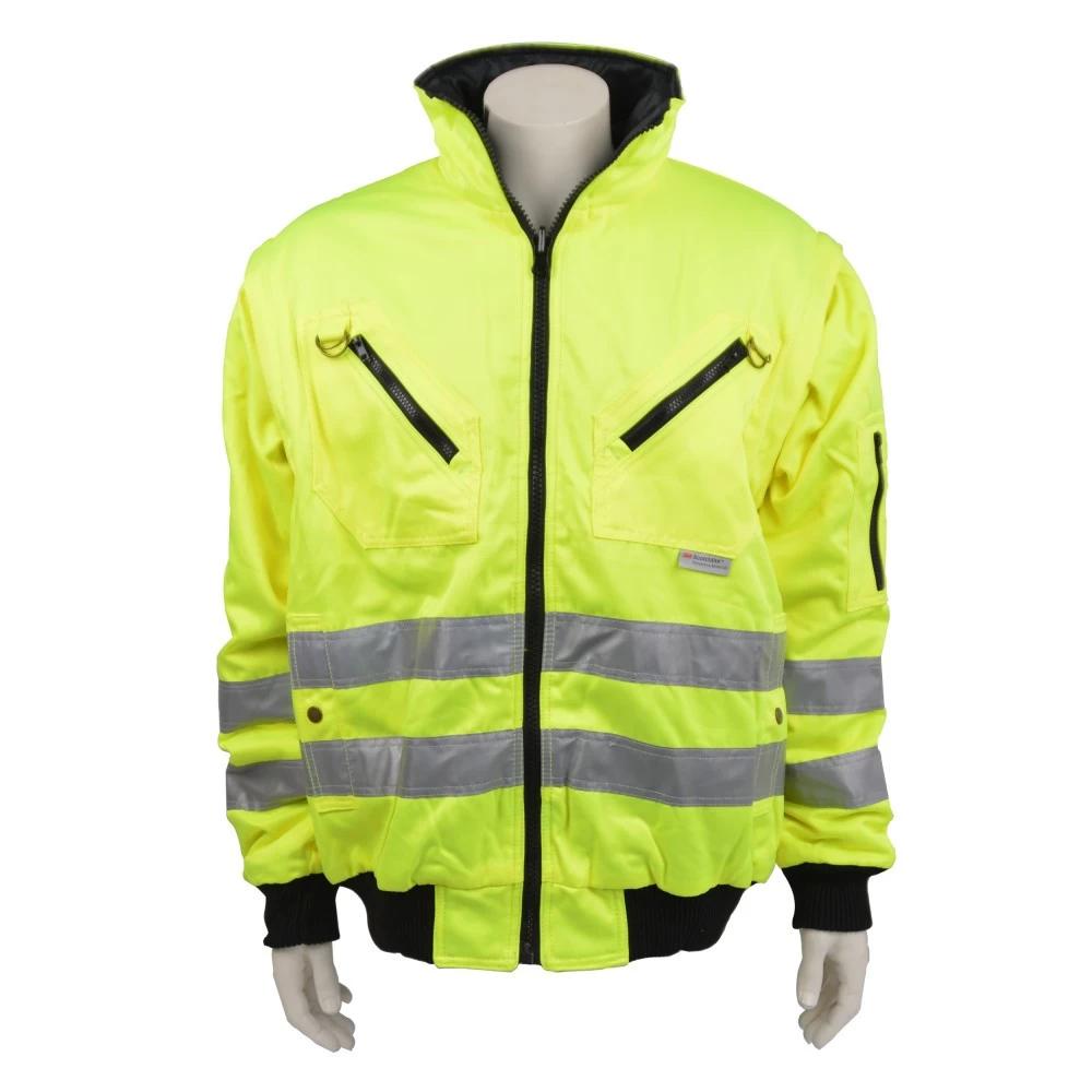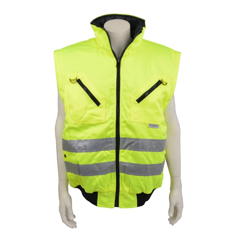 Diese wendbare Warnschutz-Pilotenjacke aus Mischgewebe mit abnehmbaren Ärmeln in der Farbe Gelb kann mit 2 Funktionen überzeugen. Sie kann als Jacke oder Weste verwendet werden und hat zwei Brusttaschen, zwei Seitentaschen und eine Ärmeltasche. Der starke Reißverschluss an den Taschen und als Jackenverschluss sorgt für eine einfache Handhabung. Die 2 x 5 cm 3M Scotchlite Reflexstreifen rund um den Rumpf und die Ärmel machen die hochwertige Arbeitsjacke auch zu einer vollwertigen Warnschutzweste.