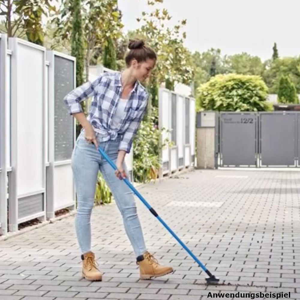 Mit der Fugenbürste und dem Teleskopstiel hast du das nötige Werkzeug um Unkraut, Moos oder Gras aus den Fugen deiner Terrasse, Hofeinfahrt oder Gehwegen zu entfernen. Durch die Schrägstellung der Stahlborsten passt sich die Bürste optimal in die Fugen und gelangt so an das Unkraut. Zudem vermeidest du den Einsatz von schädlichen Chemikalien zur Unkrautbekämpfung.