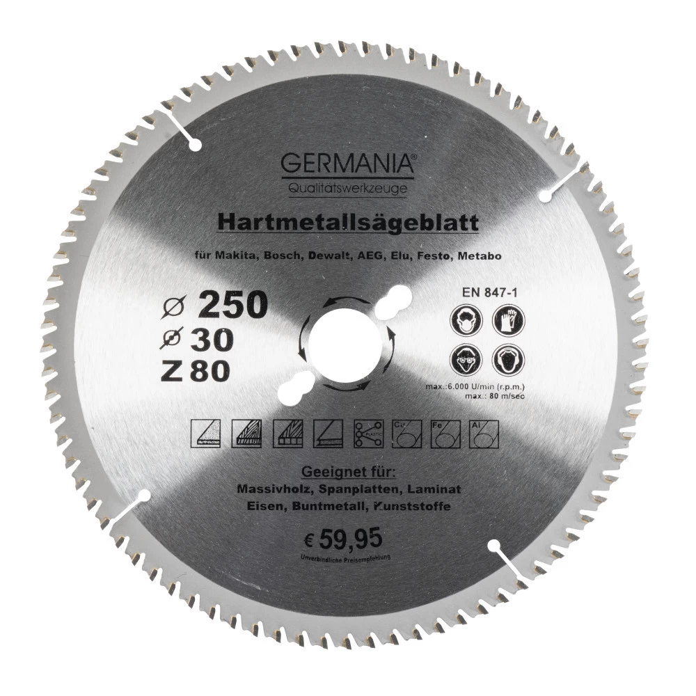 Dieses Multifunktionssägeblatt mit 250 mm Durchmesser und 80 Hartmetallzähnen von GERMANIA eignet sich für Maschinen von Makita, Bosch, Dewalt, AEG, Elu, Festo oder Metabo mit 30 mm Bohrung. Ideal für Zuschnitte in Massivholz, Spanplatte, Laminat, Eisen, Buntmetall, Kunststoffe. Die gehärteten und geschliffene Zähne aus Hartmetall sind extrem scharf und für feine und saubere Schnitte geeignet. Das Sägeblatt kann auch nachgeschärft werden.
