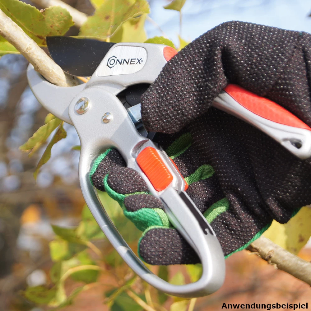 Die Ratschen-Gartenschere eignet sich zum effektiven Schneiden von stärkeren Ästen, Zweigen mit größerem Durchmesser und frischem Holz. Ausgestattet mit einer antihaftbeschichteten Klinge aus Carbon-Stahl bietet diese Schere beste Schnittergebnisse. Somit ist es möglich Äste mit deinem Durchmesser von bis zu 10 mm zu durchtrennen. Die ergonomisch ausgeformten Griffe mit eingearbeiteten Weichkomponenten sorgen für Komfort und die nötige Rutschfestigkeit. Dank des Einhand-Sicherheitsverschlusses kann die Astschere einfach geschlossen und sicher aufbewahrt werden. Zusätzlich lassen sich verbrauchte Klingen schnell und einfach auswechseln.
