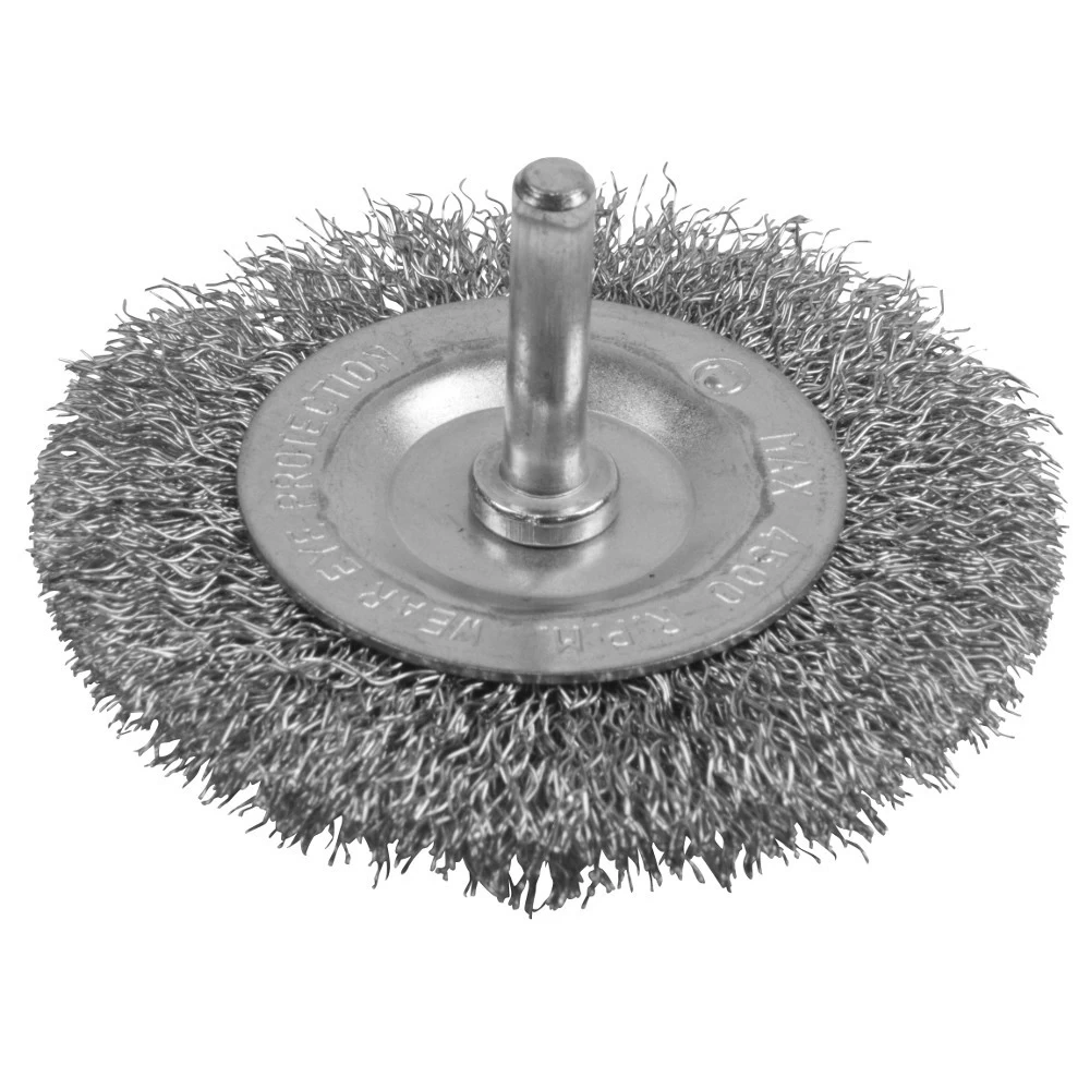Grobe Scheibenbürste mit einem Durchmesser von 100 mm und gewelltem Draht, ideal zum Reinigen, Entrosten und Entgraten von Werkstoffen wie Metall, Stein oder Holz. Die Scheibenbürste ist universell für alle Bohrmaschinen geeignet. Der Aufnahmedorn hat einen Durchmesser von 6 mm. Auch für die Vorbereitung von Löt- und Schweißarbeiten geeignet.