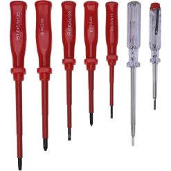 Dieses Schraubendreher-Set mit Werkzeugbeschriftung ist ein Muss für jeden Elektriker und Heimwerker. Das sieben-teilige Set beinhaltet alle gängigen Schraubendreher (Schlitz-und Kreuzschlitz) um übliche Elektroinstallationen ausführen zu können. Für eine schnelle Orientierung sind die einzelnen Schraubendreher jeweils beschriftet. Dank den abgeflachten Kanten wird ein unbeabsichtigtes Wegrollen des Werkzeuges verhindert.