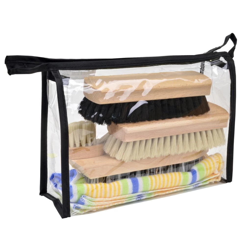 Das 6-teilige Schuhputz-Set ist die perfekte Lösung für diejenigen, die ihre Schuhe gerne in makellosem Zustand halten. Die Bürsten sind aus hochwertigem Holz gefertigt und verfügen über langlebige Kunststoffborsten, die selbst hartnäckigen Schmutz entfernen können. Das Set enthält insgesamt 5 Bürsten und 1 Putztuch. Neben einer Bürste mit Nylonborsten zum Entfernen von grobem Schmutz gibt es je eine Bürste mit hellen und dunklen Borsten zum Auftragen von Schuhcreme sowie je eine Glanzbürste mit hellen und dunklen Borsten zum Nachpolieren. Das Schuhputz-Set wird in einer praktischen Kunststofftasche mit Reißverschluss geliefert, welche besonders robust und langlebig, damit das Set jederzeit sicher und geschützt aufbewahrt werden kann.